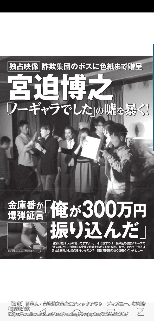| 宮迫「行列」降板へ…代役は千原ジュニア 闇営業に不倫騒動…テレビ復帰絶望的(デイリースポーツ) - Yahoo!ニュース 2014年12月に大規模詐欺グループの忘年会に出席して金銭を受け取っていたこと. (出典:Yahoo!ニュース) |