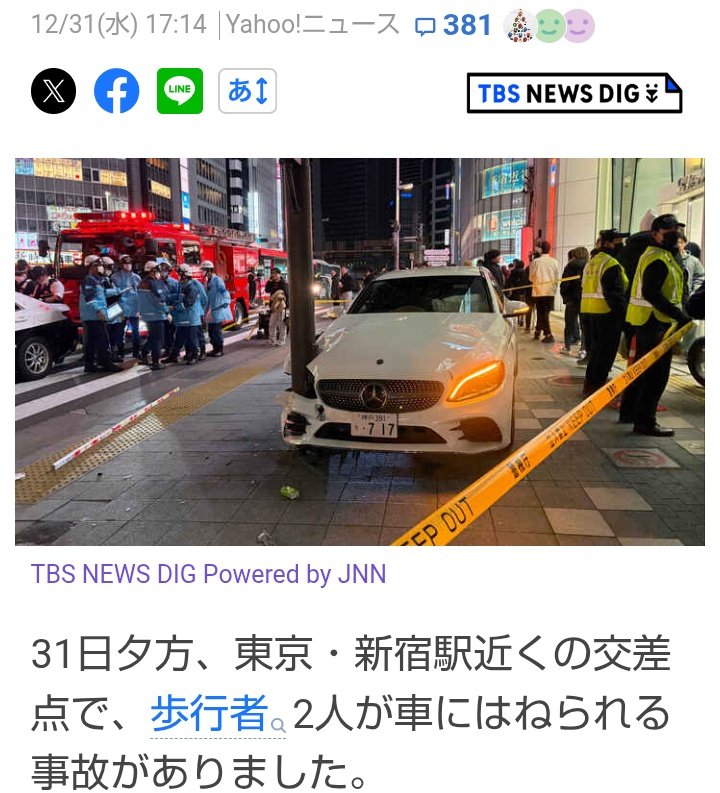 | 【速報】東京・新宿駅近くで車が歩道に突っ込む 10代女性ら3人が病院搬送 大晦日の新宿駅近くで車が歩道に突っ込み、10代の女性を含む3人が病院に搬送されました。 午後4時半ごろ、新宿区西新宿の交差点で「大ガード下で車両… (出典:ABEMA TIMES) |