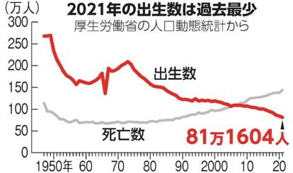 今年6月に公表された21年の出生数は、1899年の統計開始以降、過去最少の81万1604人で、前年より2万9231人減った。1人の女性が生涯に産む子どもの数に相当する合計特殊出生率は1・30だった。22年の1年間を通じた出生数は過去最少を更新する可能性がある。