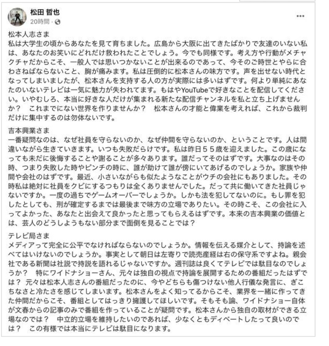 批判を浴びている文章は、松田会長が自身のFacebookアカウントに投稿したもの。性加害疑惑報道とその対応を巡り、松本さん、吉本興業、テレビ局、スポンサー、弁護士や裁判官、国民(文書内では「一般国民」と記載)、芸人、自分自身に向けて、その考えを約3500字のメッセージ形式でつづる内容でした。
