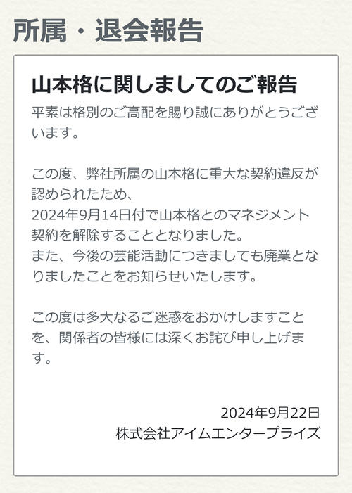 同サイトでは「この度、弊社所属の山本格に重大な契約違反が認められたため、2024年9月14日付で山本格とのマネジメント契約を解除することとなりました」と報告。また「今後の芸能活動につきましても廃業となりましたことをお知らせいたします」と伝えた。