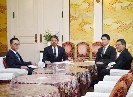 | 立民、国民の両幹事長ら 会談に臨む立憲民主党の小川淳也幹事長(右から2人目)、国民民主党の榛葉賀津也幹事長(左から2人目)ら=1日午前、国会内 (出典:) |