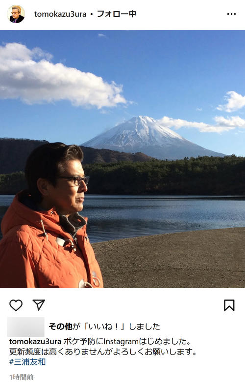 7日に一発目の投稿。「ボケ予防にInstagramはじめました。更新頻度は高くありませんがよろしくお願いします」とつづり、「#三浦友和」とハッシュタグ。富士山をバックに撮影した横顔ショットを見せた。ド派手な金髪姿の写真をアイコンにして、プロフィル欄には「俳優 三浦友和の公式アカウントです」と記した。