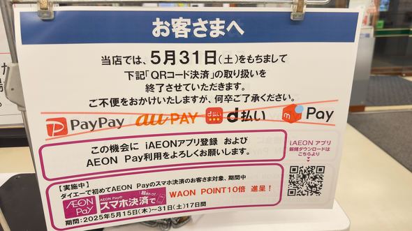 全国で190店舗以上あるスーパーマーケット「ダイエー」が、PayPayなどQRコード決済への対応を5月31日で終了した。