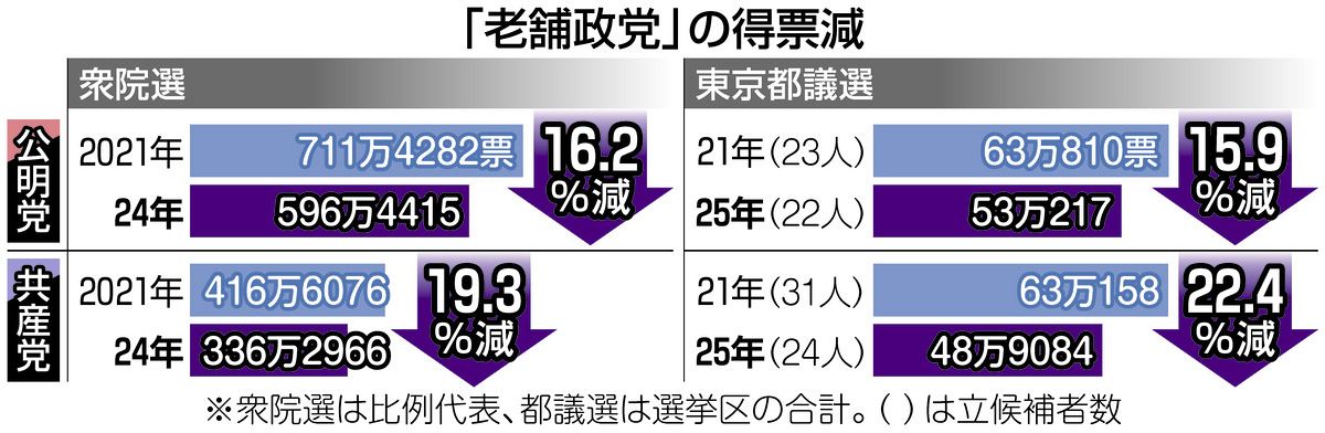 7月20日投開票の参院選を控え、「老舗政党」の公明、共産両党が集票力の落ち込みに苦しんでいる。昨年10月の衆院選や今月22日の東京都議選の得票数をみると、両党とも前回に比べ2割前後減らした。支持者の高齢化などによる組織力の低下に加え、有権者に新鮮さを感じさせる「新興勢力」の台頭も影響しているとの見方がある。