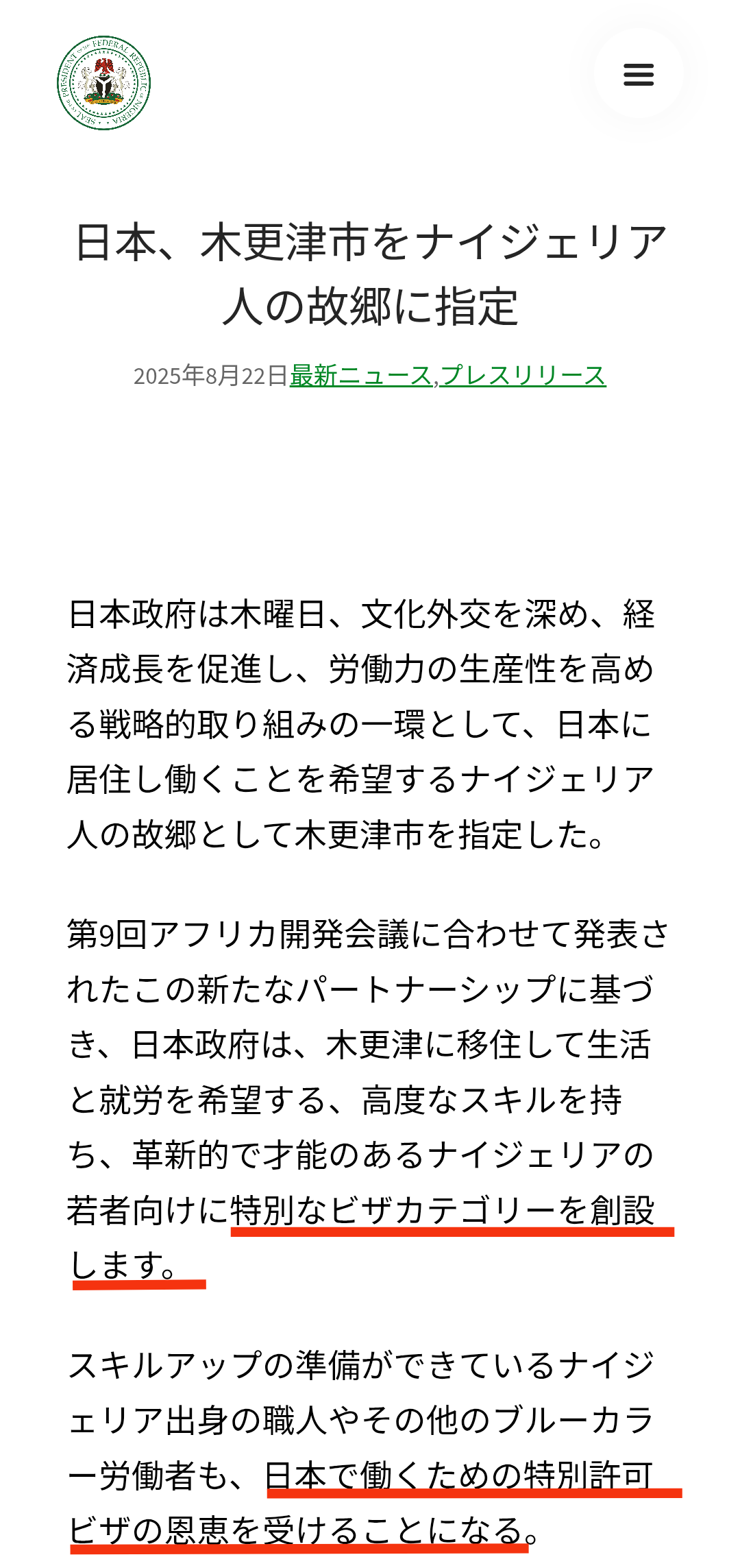 【ナイジェリア政府公式アナウンス】