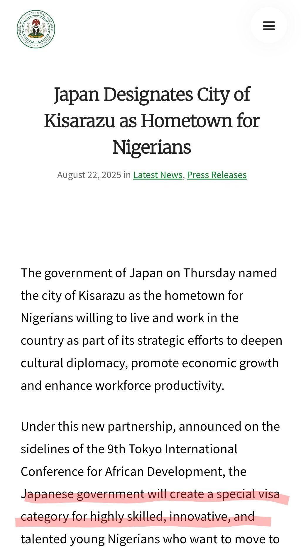 日本政府は、木更津に居住し就労したい高度なスキル、革新性、才能を持つナイジェリアの若者のために特別なビザカテゴリーを創設する予定であると彼らは言う。