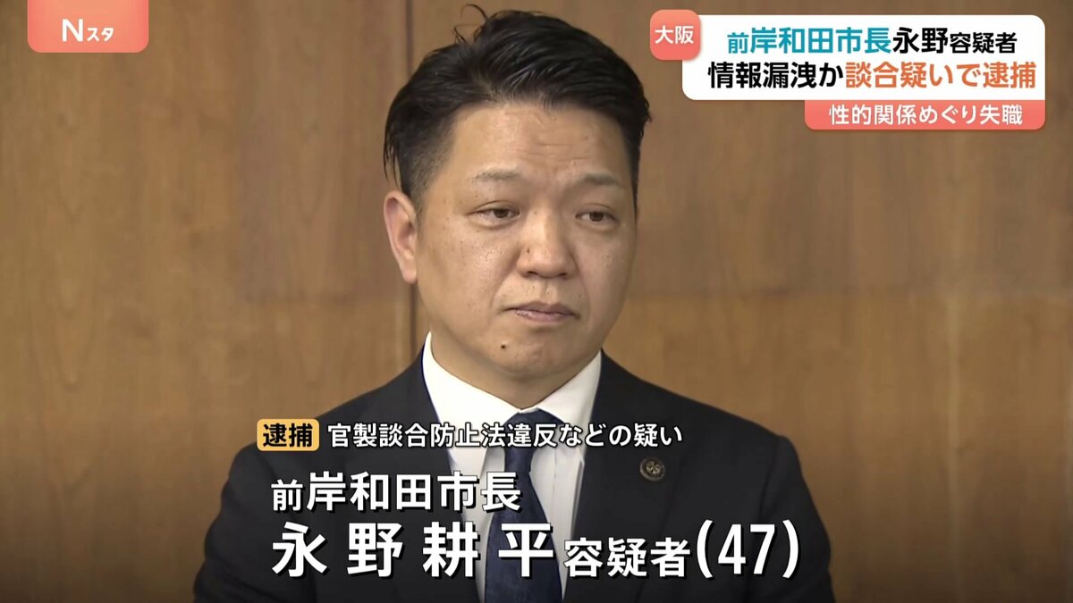 岸和田市の前市長・永野耕平が官製談合違反などの容疑で逮捕され、工事入札情報漏洩の疑いも浮上。