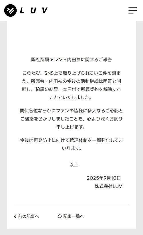 LUV事務所、内田禅との契約解除を発表。SNS疑惑拡散に伴う活動困難と判断し、管理体制強化へ。
