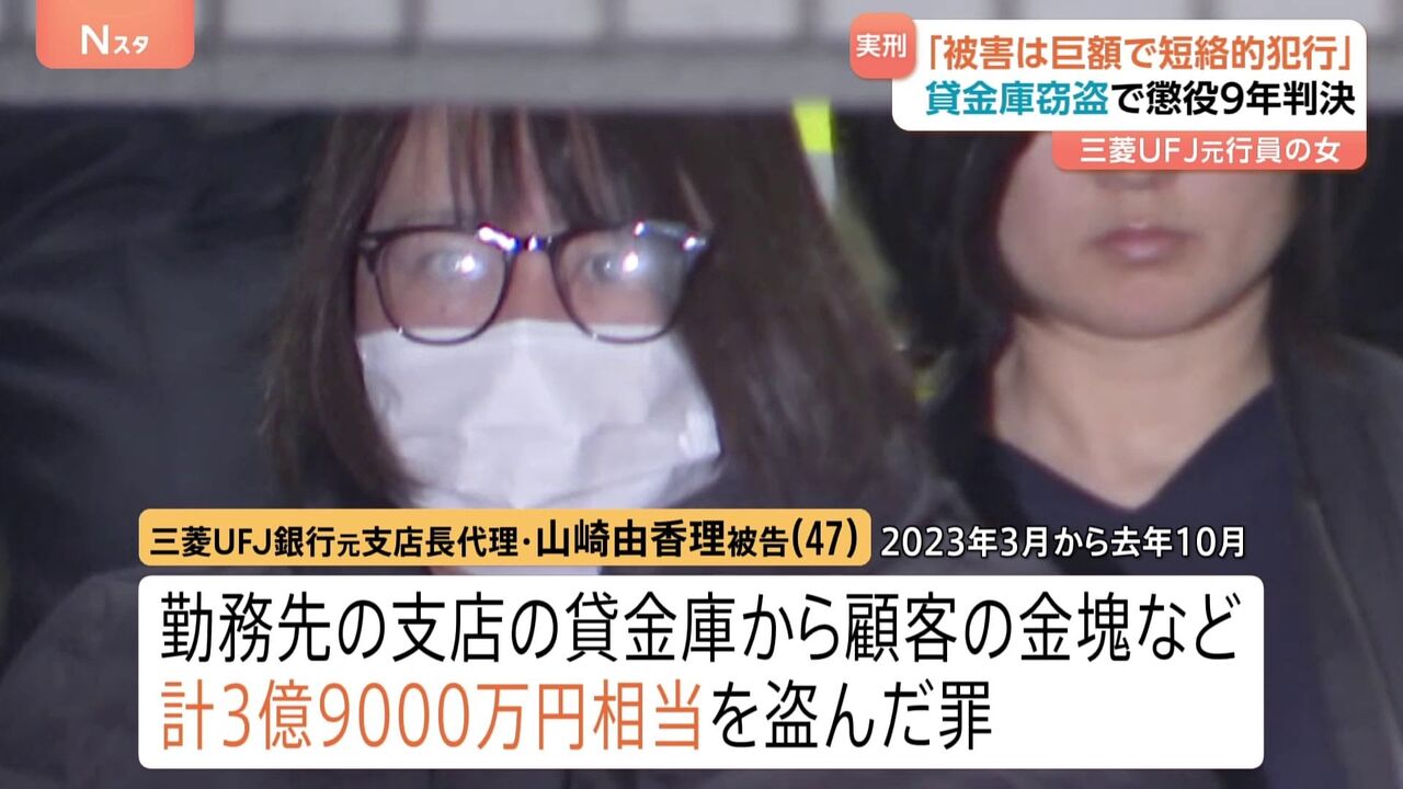 三菱UFJ銀行の貸金庫から客の金塊などを盗んだ罪に問われている元行員の女に対し、東京地裁はさきほど、懲役9年の実刑判決を言い渡しました。