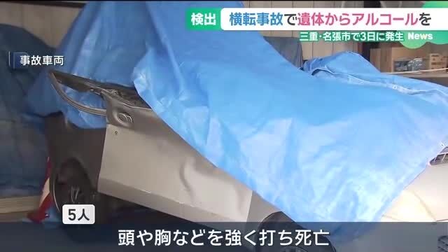 三重県名張市で軽乗用車が横転し、高校生を含む男女5人が死亡、1人が重傷を負った事故で、県警は7日、司法解剖の結果、少なくとも1人の遺体からアルコールが検出されたと発表した。捜査に支障があるとして、何人から検出したか明らかにしていない。県警は運転手の特定を進め、飲酒運転の可能性がなかったか調べる。