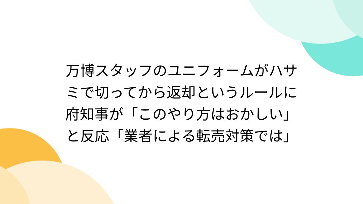 | 万博のスタッフユニホーム返却問題 吉村洋文知事が言及「このやり方はおかしいと思う」 …博のスタッフユニホーム返却時のルール騒動に言及した。 これは一部報道媒体が「万博のスタッフユニホーム「はさみで切ってから返して」 返却時のルールに悲… (出典:オリコン) |