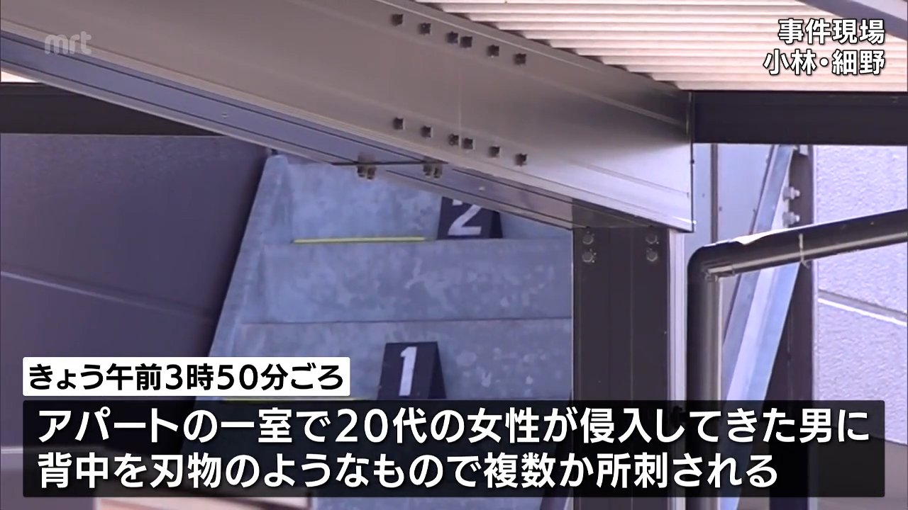12日午前3時50分ごろ、宮崎県小林市のアパートで、20代女性から「男が家の中に入ってきて背中を刺された」と110番があった。県警によると、女性は刃物のようなもので背中を複数回刺されており、病院に搬送されたが、会話はできる状態だった。県警は殺人未遂事件とみて、現場から逃走した男の行方を追っている。