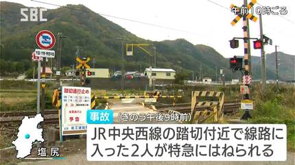 4日午後8時50分頃、長野県塩尻市宗賀のJR中央線の長瀬踏切付近で、線路内にいた2人が長野発名古屋行きの特急列車「しなの」(6両編成)にはねられ死亡した。乗客と運転士、車掌計約110人にけがはなかった。