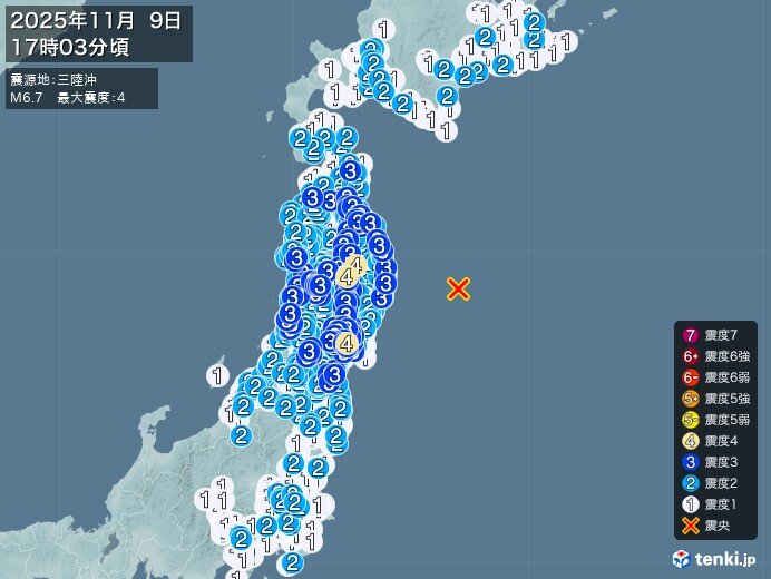 9日午後5時3分ごろに三陸沖の深さ16キロで発生し、最大震度4を観測したマグニチュード(M)6・9の地震について、東京大の平田直名誉教授(観測地震学)は、「プレート(岩盤)の境界で起きた逆断層型の地震で間違いないだろう」と話す。