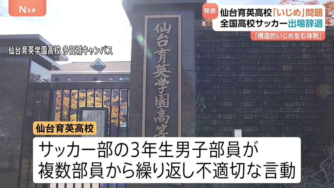 仙台育英高校のサッカー部で男子部員が継続的に他の部員から不適切な言動を受けていた問題を受けて仙台育英高校は、全国高校サッカー選手権大会への出場辞退を決めたことが分かりました。