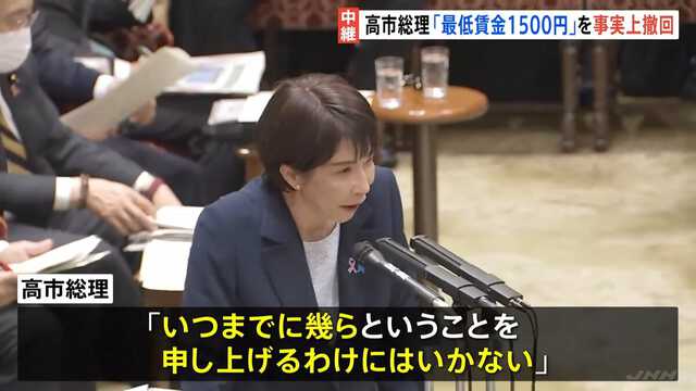 「時給1500円を目指すという内閣もたしかあったように記憶しておりますけれども、それがもう今はないという考え方でよろしいんでしょうか。明確な数字を上げていくということをですね、是非努めていただきたいと思いますが、高市総理いかがでしょうか」