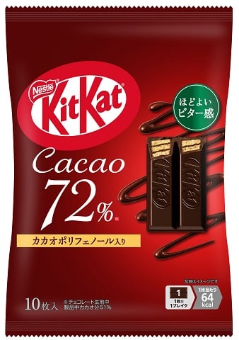 キットカットの「カカオ 72% 10枚」と「鉄分補給 with ミロ 10枚」はいずれも希望小売価格が777円から1015円へと引き上がる。値上げは25年3月以来1年ぶり。
