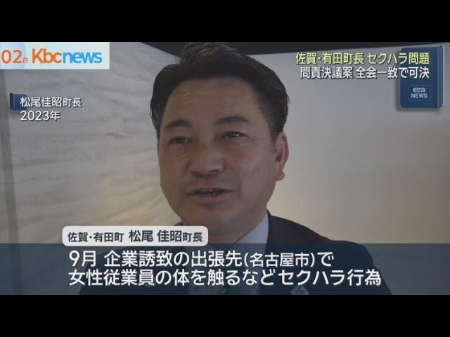 佐賀県有田町の松尾町長が出張先で女性にセクハラ行為を行い、町議会は問責決議を可決。町長は責任を取り辞職する意向を示した。