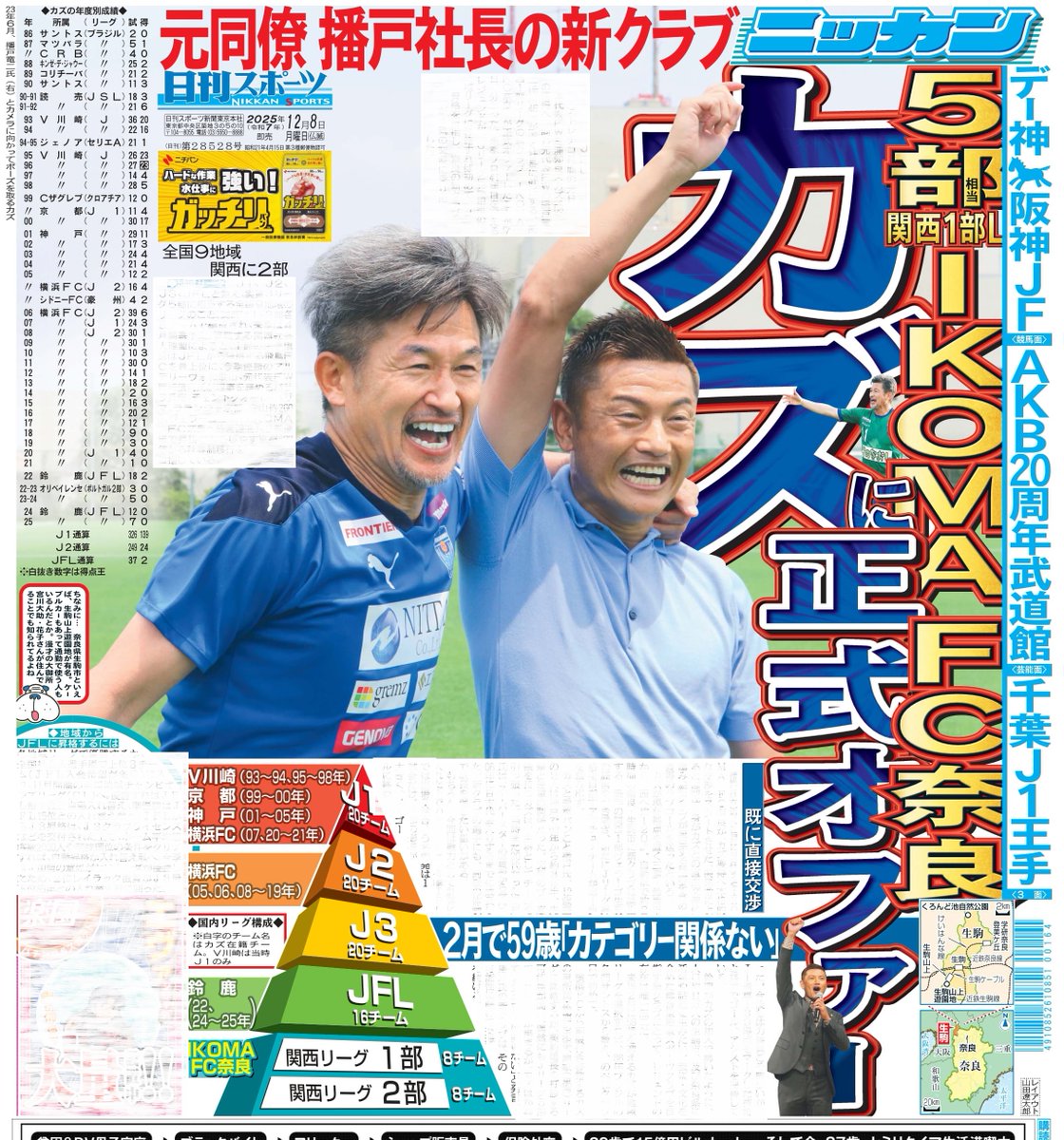 播戸氏が近く社長に就任するIKOMA FC奈良が、カズ獲得へ本格的な交渉をスタートさせた。関係者によると、同氏自身がカズとの直接交渉に臨み、新クラブが誕生する経緯を含め、既に獲得のラブコールを送ったという。