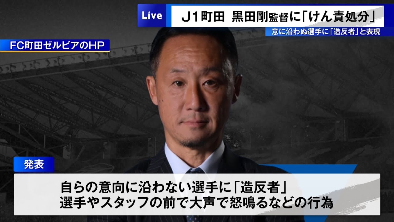 発表によると、今回の懲罰は「黒田監督は、2023年頃からFC町田ゼルビアに所属する選手らの前で、自らの意向に沿わない選手がいれば、造反者といった表現を用いて排除する意図を持った発言や、練習中に選手およびチームスタッフの前で特定のコーチに対して大声で怒鳴る行為、懇親会の場でのスタッフに対する暴言等の不適切な発言があった」ことが対象になるとのこと。黒田監督と町田には、けん責(始末書をとり、将来を戒める)処分を科すことが決まっている。