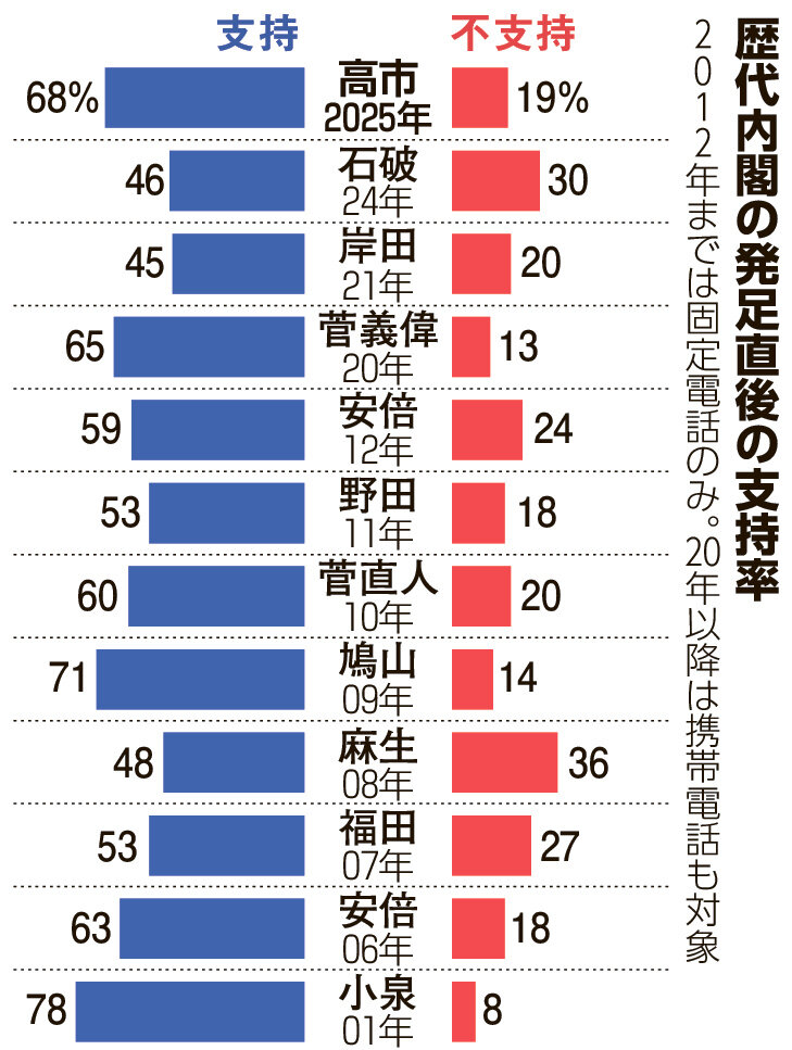 高市早苗内閣の支持率が、発足2カ月を迎えても報道各社の世論調査で高い水準を保っている。発足直後の「ご祝儀相場」が薄れ、下降するケースが多い中、60%台半ばから70%台半ばを維持。初の女性首相への期待感や、減税政策や中国への強硬姿勢を評価する人が多いとみられる。ただ、参院で与党が過半数を持たない不安定な政治情勢に変わりはなく、政権内からは先行きを不安視する声が消えていない。