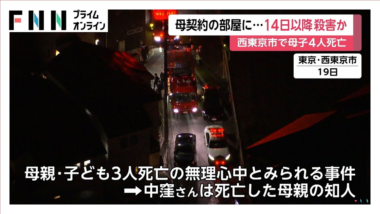 西東京市で母親と子ども3人の無理心中事件が発生。母が交際相手の遺体発見前に出入りする姿が確認され、捜査が進行中。
