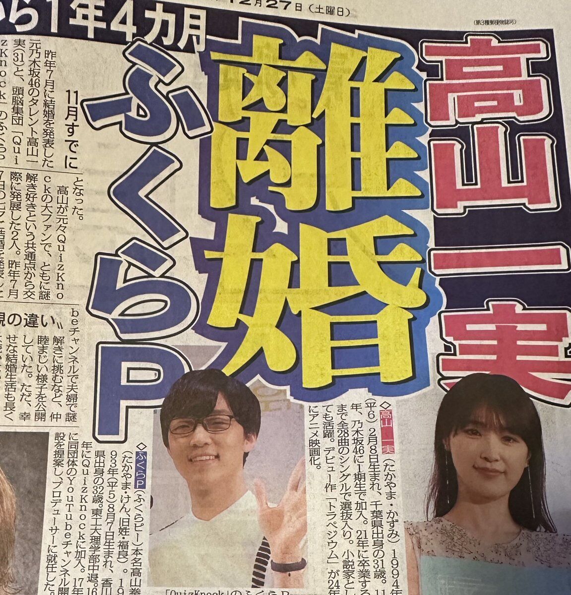 昨年7月に結婚を発表した元乃木坂46のタレント高山一実(31)と、頭脳集団「QuizKnock」のふくらP(32)が離婚したことが26日、分かった。27日に正式発表される。スポニチ本紙の取材では11月に離婚しており