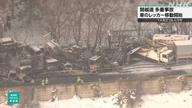 最初の事故は26日午後7時25分ごろ、トラックがスリップして道路に対して横向きに止まったところに、大型トラックが衝突。さらに避けようとした後続の車同士が断続的に衝突していった。最終的にトラック42台を含む67台が絡み、うち20台が車両火災で燃えた。