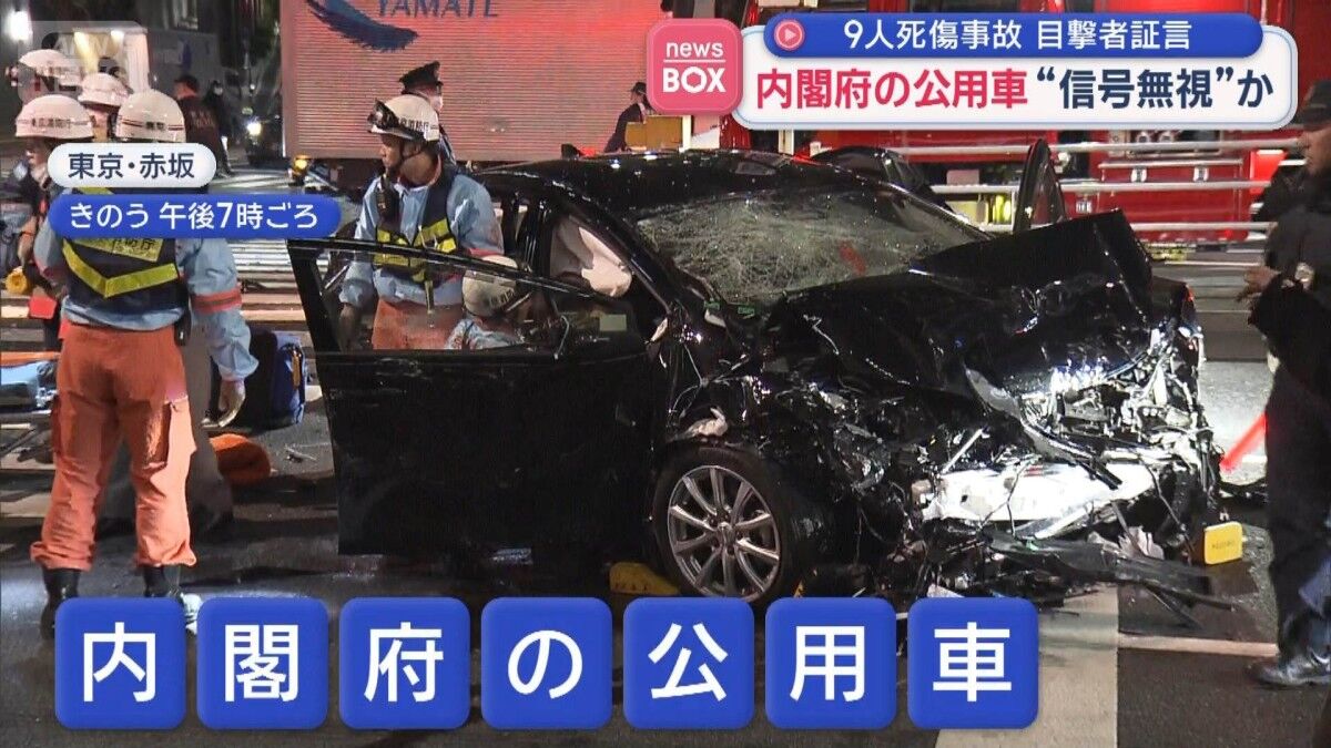 | | 内閣府公用車の多重事故 赤信号になってから1分以上経って交差点進入 東京・赤坂の交差点で9人死傷 …東京・赤坂で内閣府の公用車がワゴン車と衝突するなどし、9人が死傷した多重事故。 その後の捜査関係者への取材で、公用車が赤信号になってから1分以上経っ… (出典:0:28) |